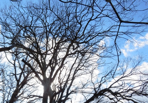 Obraz premium 日本の田舎の風景 1月 裸木の梢と青空と雲