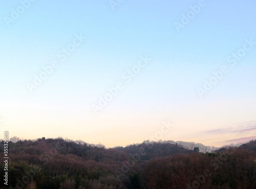 Fototapeta premium 日本の田舎の風景 1月 真冬の朝日と山と空 朝焼け