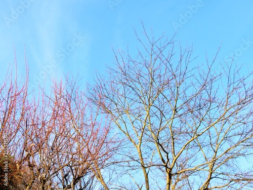 Obraz premium 日本の田舎の風景 1月 冬の山の木々と青空 桜と梅
