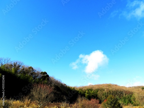 Obraz premium 日本の田舎の風景 1月 冬の山の木々と青空