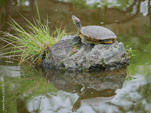 Fototapeta premium 池にある岩に登る亀