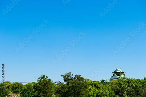 Obraz premium 森に囲まれた大阪城の天守閣と快晴の空