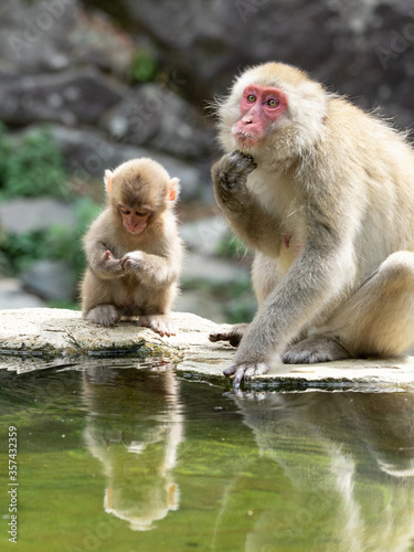 Naklejka premium 夏の長野県、地獄谷野猿公苑のニホンザル 親子ザル 8月