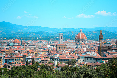 Obraz premium イタリアのフィレンツェの歴史的建造物が並ぶ街並みを俯瞰で撮影 ドゥオーモがそびえ立つ