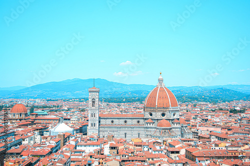 Obraz premium イタリアのフィレンツェの歴史的建造物が並ぶ街並みを俯瞰で撮影 ドゥオーモがそびえ立つ