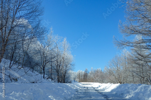 Obraz premium 【霧氷に囲まれた雪道】ビーナスラインの冬景色