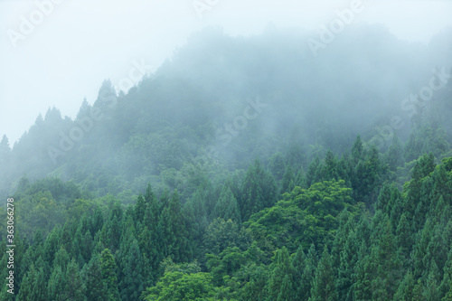 Obraz premium 朝霧に包まれた山 雨の日 森林 梅雨の時期