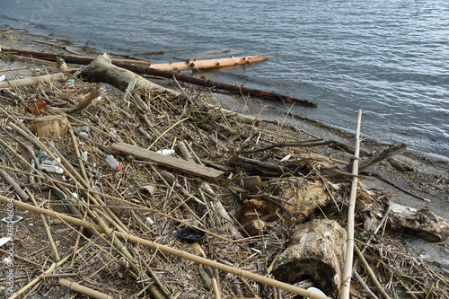 Obraz premium 海辺に打ち上げられた漂流物やゴミ