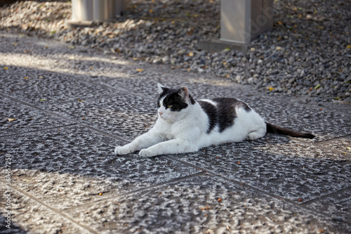 © Yoshimaki, Fototapeta premium 石畳の上に座るオスの地域猫