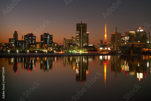 © homebell, Fototapeta premium 晴海旅客ターミナルのプールの水面に反射する都心の夜景