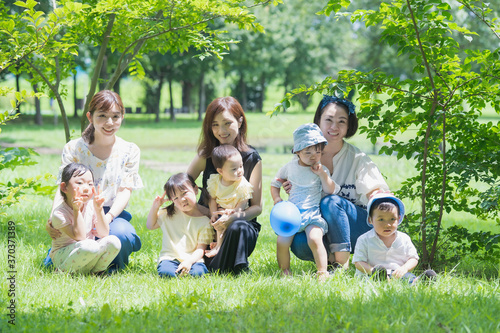 Fototapeta premium 緑あふれる公園で遊ぶ家族たちの集合写真