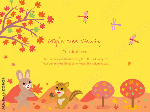 Fototapeta premium ウサギとリスと秋の紅葉狩りの風景のポストカード