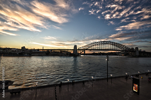 © palzafenon, Naklejka premium 風にたなびく夕焼け雲を見上げるハーバーブリッジ