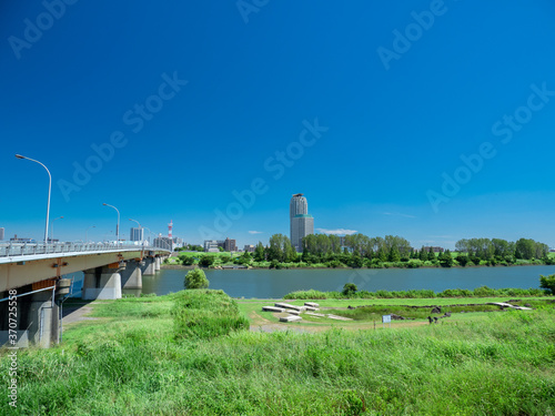 Obraz premium 青空の広がる荒川と埼玉県川口市の風景。8月。