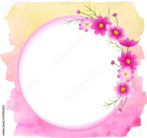 Fototapeta premium ピンクのグラデーションのコスモスの丸フレーム、リース、イエローピンクの水彩の背景、秋イメージ