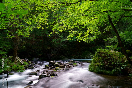 Obraz premium 夏の緑一杯の森と川の流れ