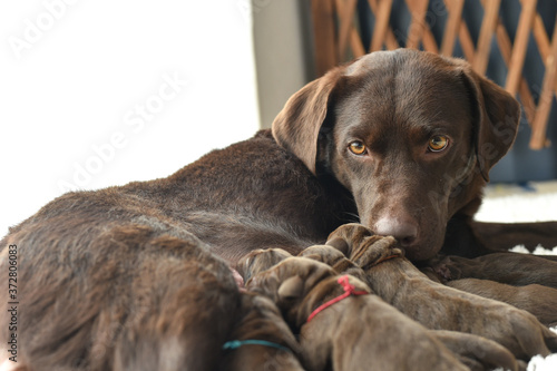 Obraz premium 授乳をするラブラドールレトリバーの親子