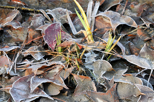 © IRCデータ・プロ・テクニカ, Fototapeta premium 冬に霜が降りた枯葉
