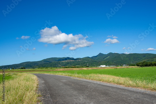 © Joe, Fototapeta premium 白い雲と青空と水田のある田舎道 鹿児島県出水平野