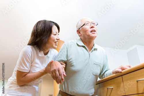 Obraz premium シニア男性の歩行介助をする介護福祉士