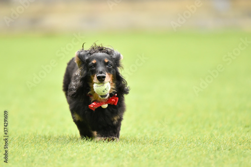 Fototapeta premium ドッグランで遊ぶミニチュアダックスフンド