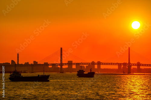 Fototapeta premium 貨物船のシルエットと横浜の街並みの夕景