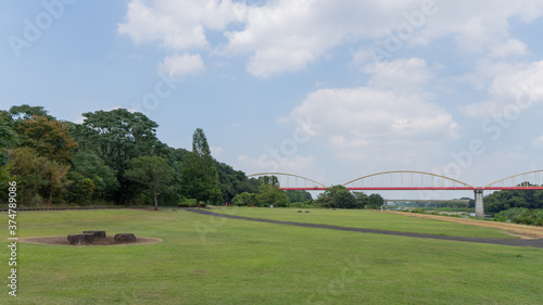 © shigemaru_graph, Obraz premium 青空と芝生の大地と橋梁