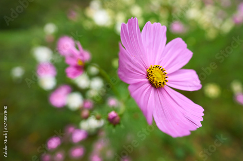 Obraz premium 美しい秋の風景。コスモスが咲く秋の草原。