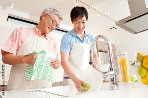 © Paylessimages, Obraz premium 食事の後片付けをする親子