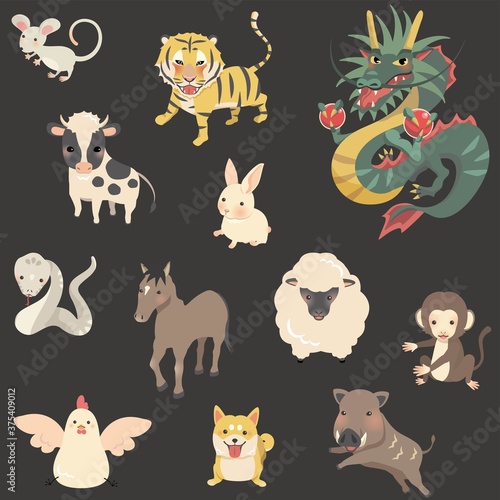 Fototapeta premium 干支 十二支セット 主線無し 黒背景
