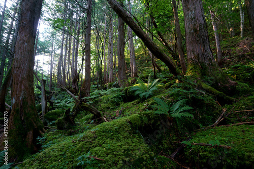© askaflight, Naklejka premium 夏の朝、苔むした巨木のある森の中を歩く