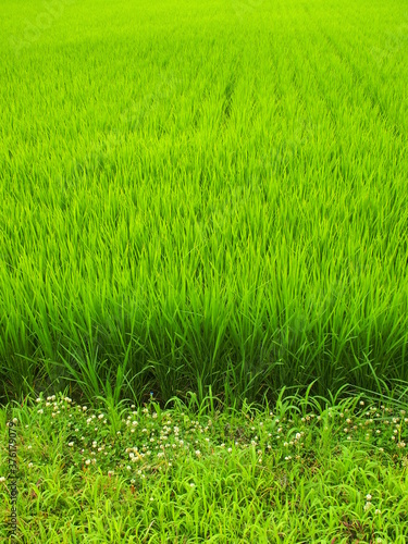 Obraz premium 7月の青田と白詰め草咲く畦道風景