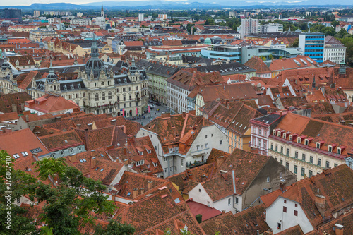 Obraz premium オーストリア グラーツのシュロスベルクの丘から見えるグラーツ市街歴史地区と市庁舎