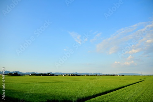 Fototapeta premium 青空のもとの一面の水田と地平線