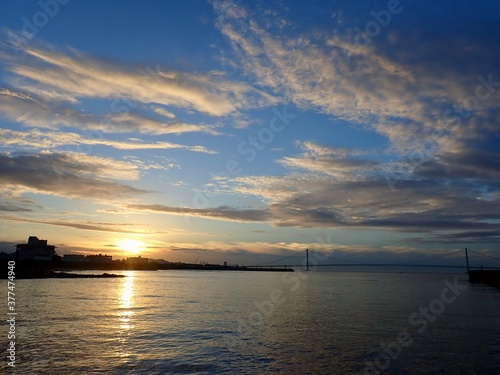 Naklejka premium 青空に輝く朝の太陽と、太陽に照らされた穏やかな海