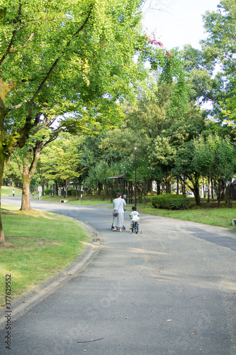 Naklejka premium 公園を自転車とベビーカーで散歩する日本人の親子