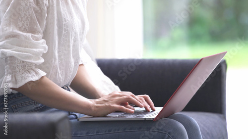© aijiro, Naklejka premium ソファーでラップトップをタイピングする若い女性