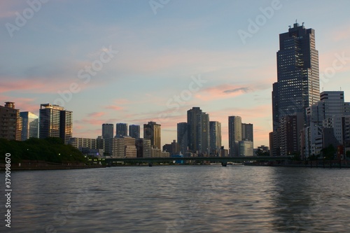 Naklejka premium 隅田川夕景 霊岸島水位観測所から見る下町の夕日 赤く染まった雲