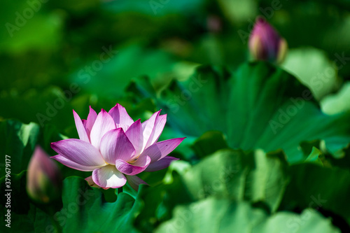 Obraz premium 夏の蓮池に咲くピンクの綺麗な蓮の花 (福岡県行橋市)