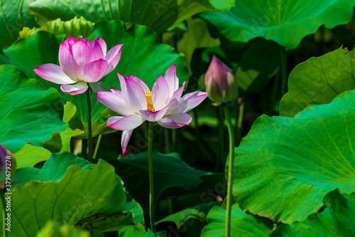 Fototapeta premium 夏の蓮池に咲くピンクの綺麗な蓮の花 (福岡県行橋市)
