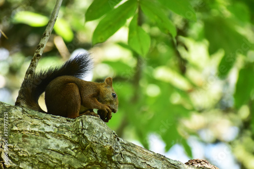 Obraz premium 日陰でクルミを食べる夏のエゾリス
