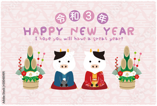 Fototapeta premium 令和3年 着物のウシと門松 淡いピンク背景 年賀状テンプレート