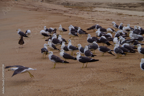 Fototapeta premium 砂浜で飛び立つカモメの群れ 京都府 海岸の風景