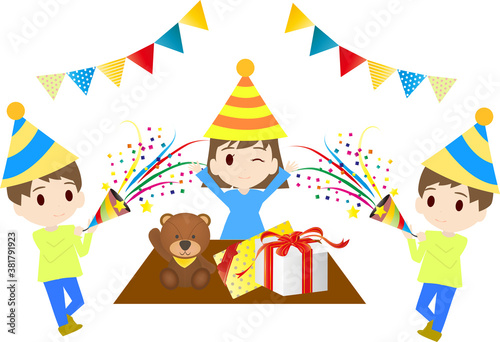 Fototapeta premium パーティーをしてプレゼントをもらう可愛い子供のイラスト