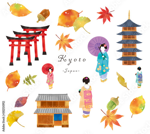 Fototapeta premium 秋の舞妓さんと京都の町家とお寺のセットイラスト