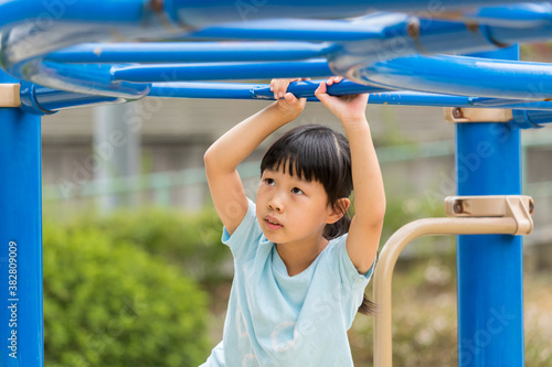 © zheng qiang, Fototapeta premium 真夏の公園で雲梯遊具を遊んでいる可愛い子供