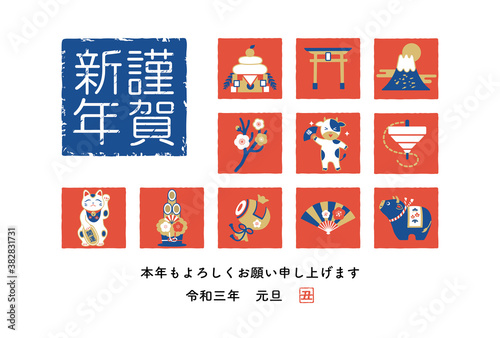 Obraz premium 2021年の年賀状デザイン 丑年 縁起物