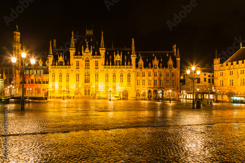 © pespiero, Obraz premium ベルギー 夜のブルージュ歴史地区のマルクト広場と州庁舎