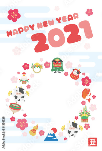 Fototapeta premium 2021年の丑年の年賀状のイラスト