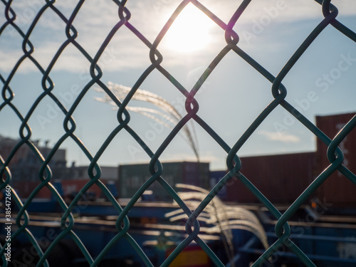 Fototapeta premium フェンス越しに見る太陽とススキ 本牧ふ頭